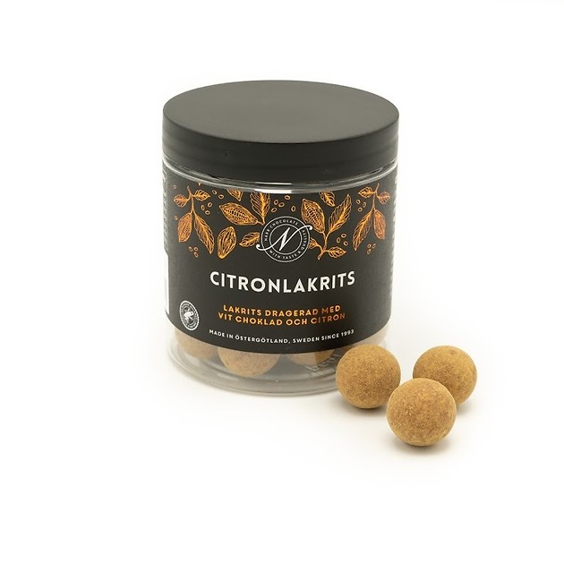 Beskrivning: Lakrits dragerad med vit choklad och citron.
