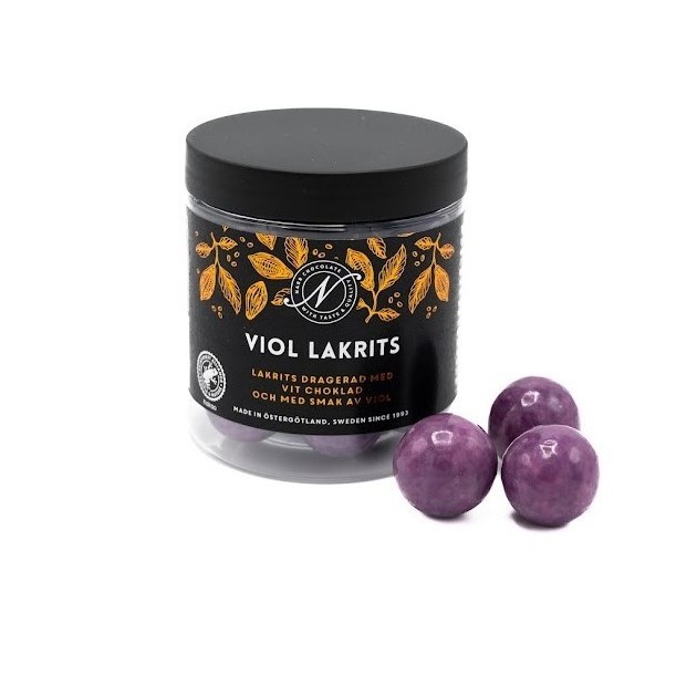 Beskrivning: Lakrits dragerad med vit choklad och med smak av viol.